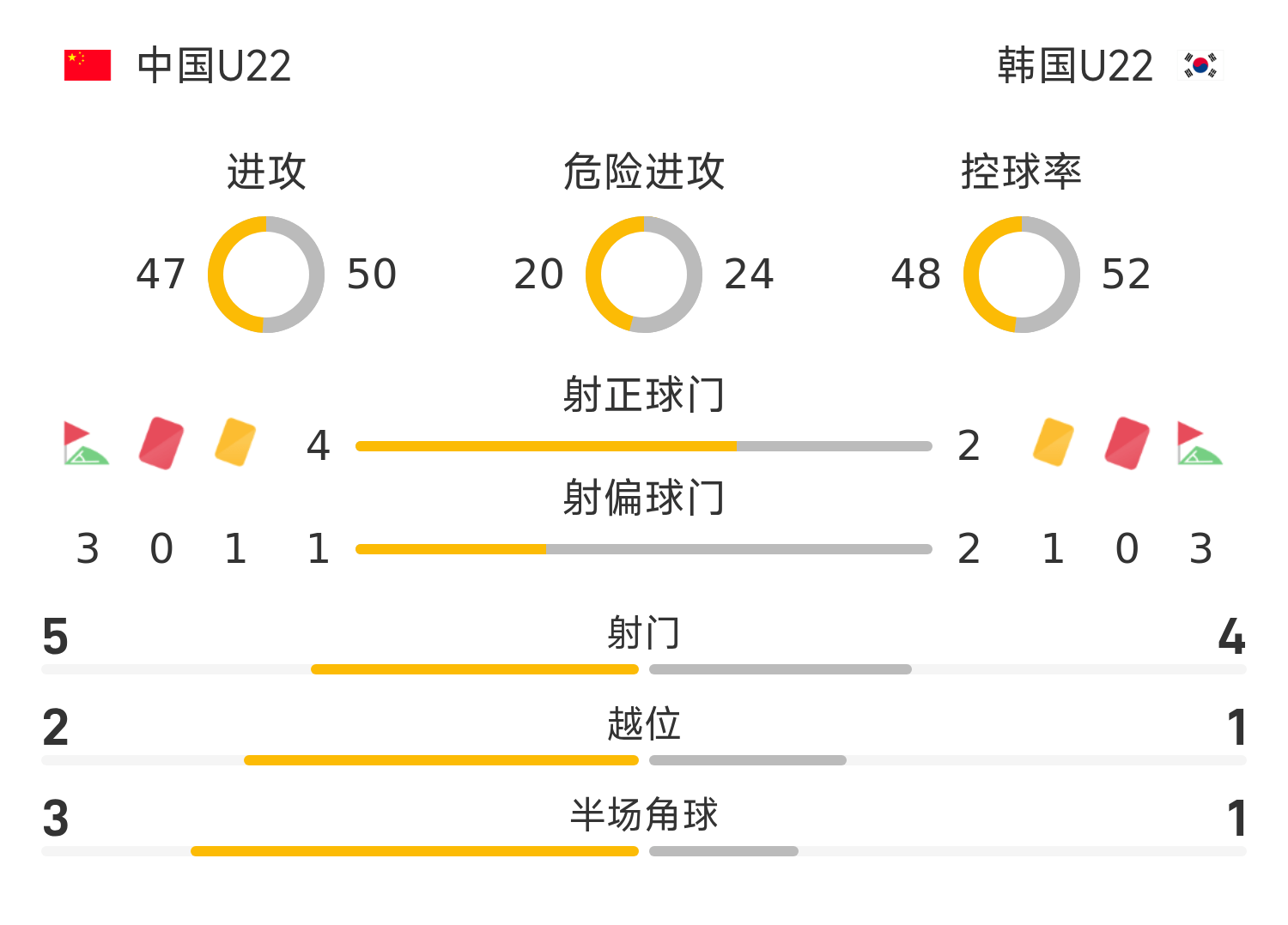 韩国U22首发阵容:1-文炫浩、24-张硕桓(82’20-朴声勋)、22-朴俊誓(82’5-赵炫泰)、4-丁升培(67’7-朴昇浩)、23-信敏河、17-李建熙、2-姜民俊、16-朴贤宾、8-金东进、19-金容鹤(68’11-姜成进)、18-郑在尚(68’9-金明俊)