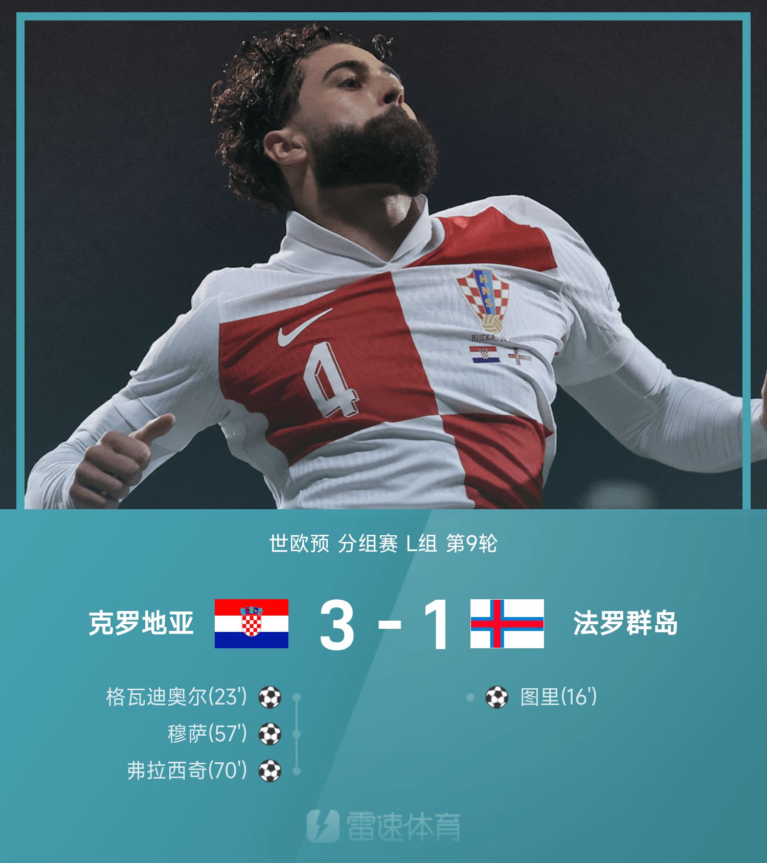 6686体育平台11月15日讯 26赛季世欧预分组赛L组第9轮,克罗地亚3-1战胜法罗群岛。全场竞赛,图里折射破门协助法罗群岛客队场领跑位,随后格瓦迪奥尔、穆萨、弗拉西奇连续破门完成逆转,莫德里奇第61分钟被换下,克罗地亚提前晋级世杯赛。