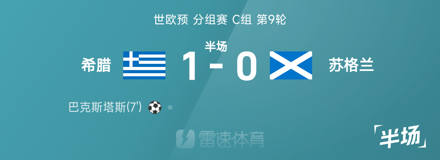 世欧预半场:巴克斯塔斯破门,帕夫利迪斯伤退,希腊1-0苏格兰