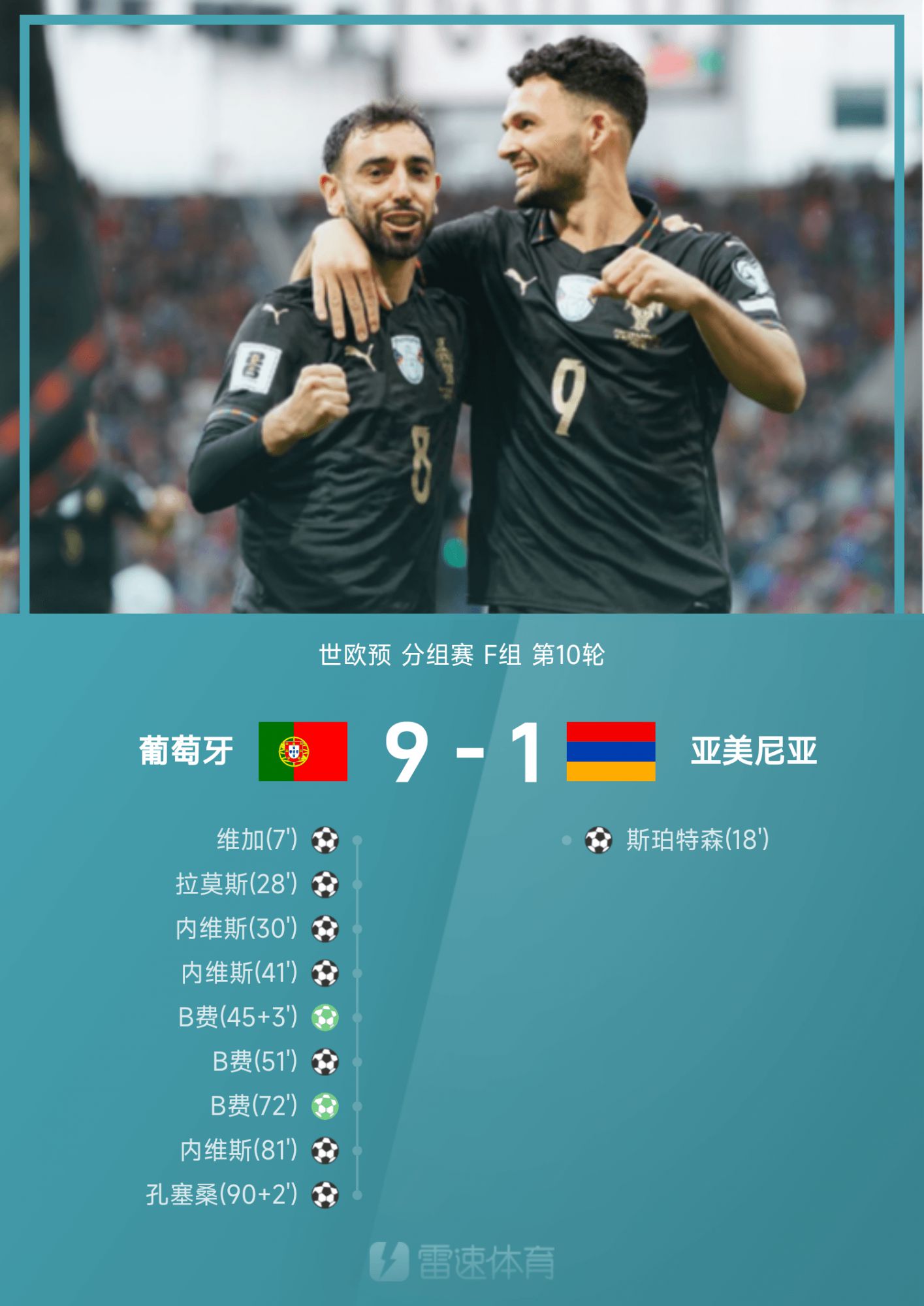 世欧预战报:内维斯、B费戴帽,葡萄牙9-1狂胜直通世杯赛