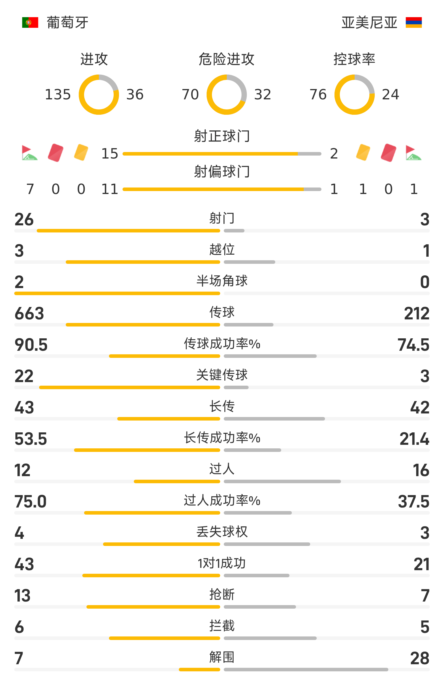 葡萄牙首发阵容:1-科斯塔、20-坎塞洛(73’18-努内斯)、2-塞梅多、3-迪亚斯(73’21-内维斯)、13-维加、8-B费、10-B席(56’7-福布斯)、17-莱奥(56’19-孔塞桑)、23-维蒂尼亚(67’11-菲利克斯)、15-内维斯、9-拉莫斯