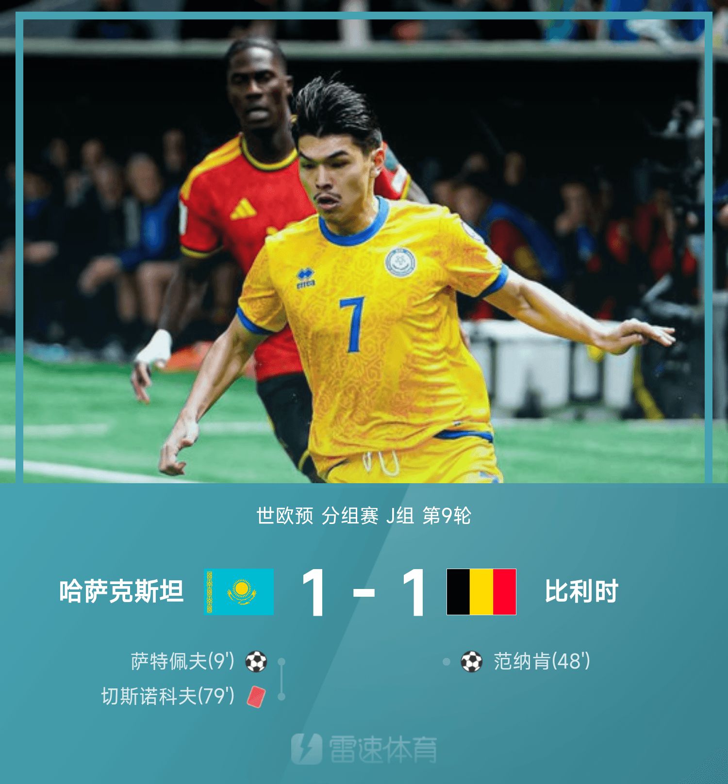 6686体育平台11月15日讯 26赛季世欧预分组赛J组第9轮,哈萨克斯坦1-1战平比利时。上半场竞赛,萨特佩夫抓住泰特差错机会单刀破门,下半场范纳肯顶球破门扳平赛果分,随后比利时发起猛攻,切斯诺科夫蹬踏染红,但1-1的赛果分保持到终场,比利时无缘提前晋级世杯赛。