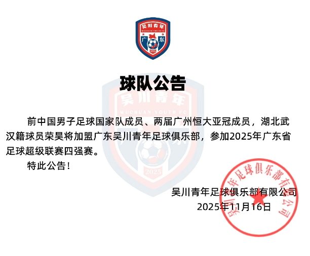 6686体育平台11月16日讯 广东吴川青年足球俱乐部发布公告,38岁的前国脚荣昊正式加盟。