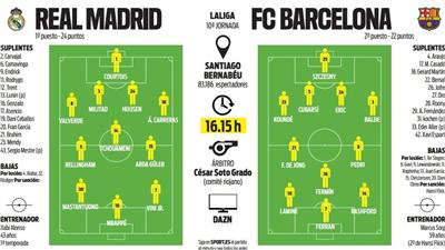 6686体育平台10月26日讯 西甲第10轮将迎来万众瞩目的西班牙国家德比,皇马将坐镇在主队场迎战巴萨。西班牙媒体《每日体育报》预测了双方本场竞赛的首发阵容。