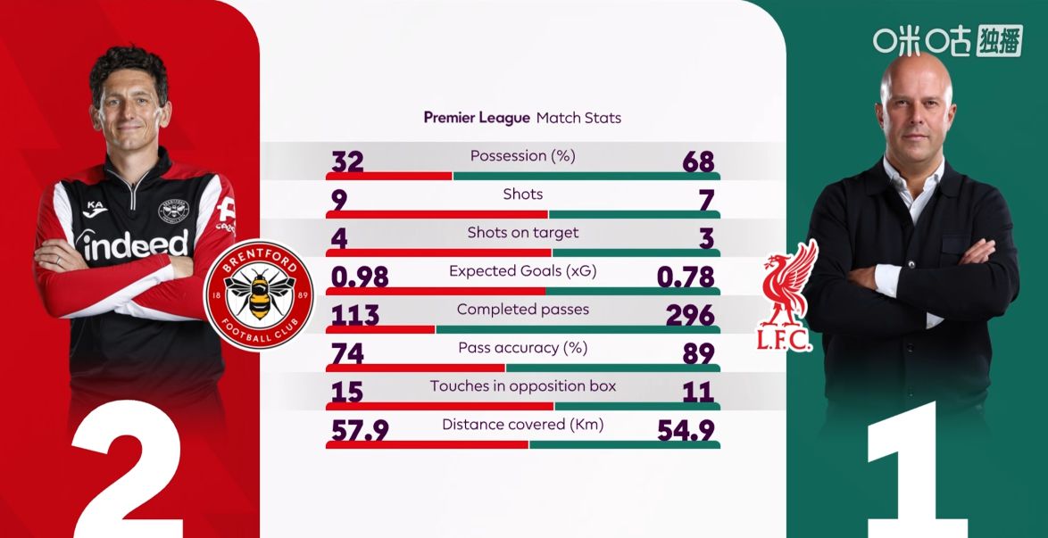 6686体育平台10月26日讯 25/26赛季英超第9轮,利物浦客队场对阵布伦特福德,半场竞赛战罢,利物浦以1-2暂时跟跑位。