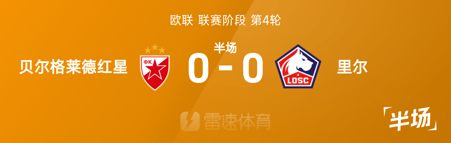 6686体育平台11月07日讯 25/26赛季欧联联赛事阶段第4轮,贝尔格莱德红星迎战里尔。半场战罢,双方赛果分暂为贝尔格莱德红星0-0里尔。