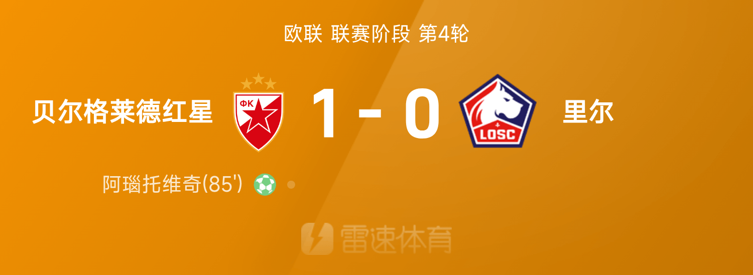 欧联战报:阿瑙托维奇点射建功,贝尔格莱德红星1-0战胜里尔