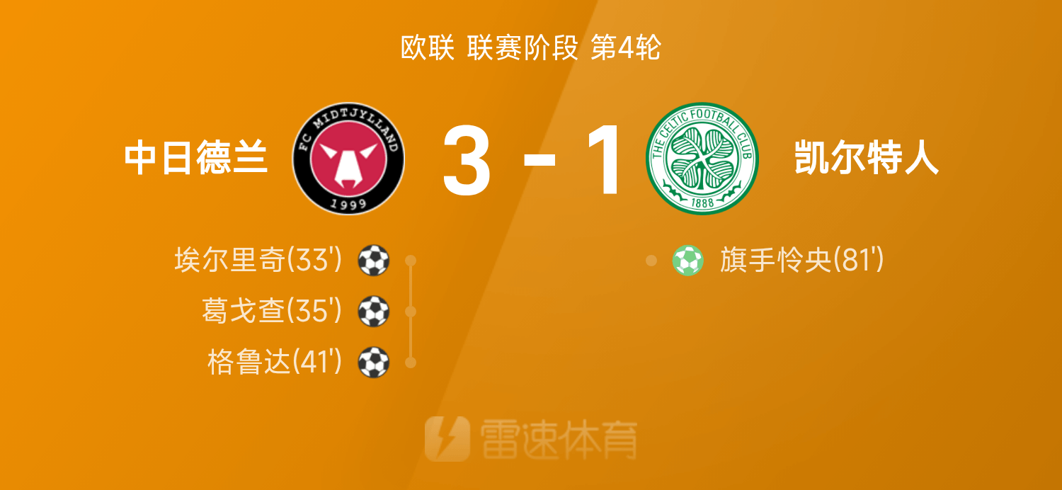 6686体育平台11月07日讯 25/26赛季欧联联赛事阶段第4轮,中日德兰3-1战胜凯尔特人。全场竞赛,葛戈查发挥出色贡献1射1传,格鲁达、埃尔里奇破门建功,旗手怜央破门难救主。