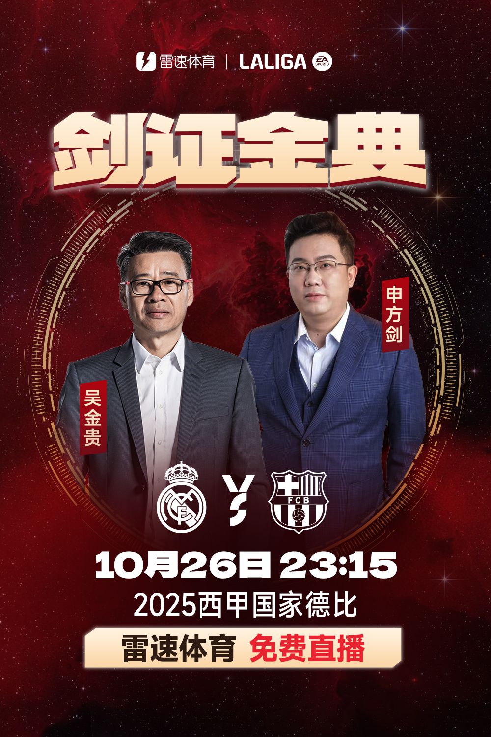 北京时间10月26日23:15,西甲第10轮,皇家马德里将在主队场迎战巴塞罗那,这将是本赛季首次西班牙国家德比。6686体育平台将免费视频直播这场焦点对决,并非常荣幸地邀请到了两位特殊嘉宾担任本场竞赛的解说,分别为知名教练员吴金贵以及著名解说员申方剑。