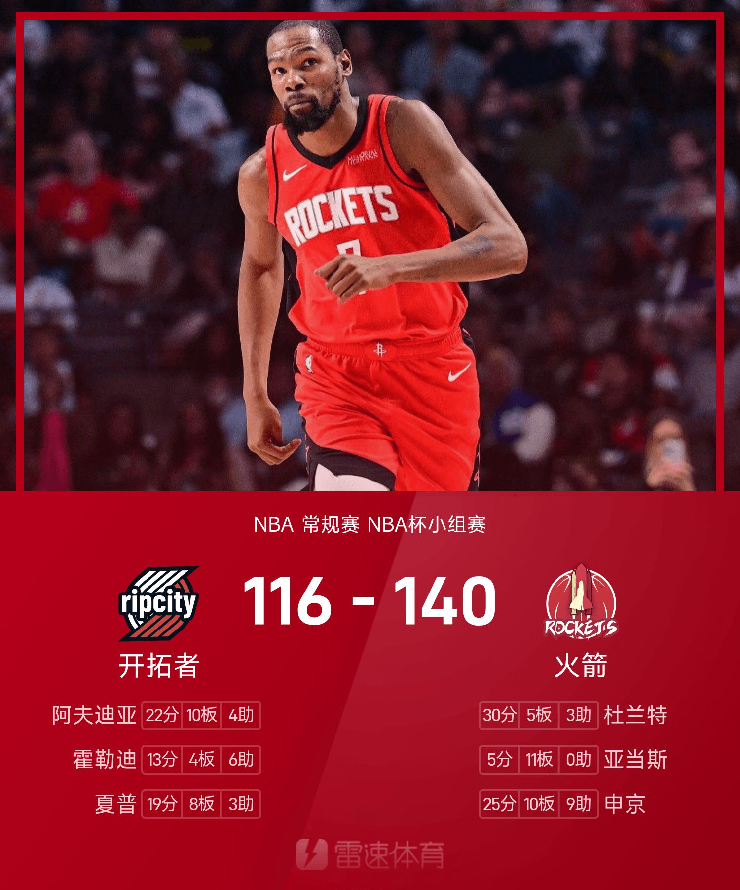NBA杯战报:杜兰特30分,火箭140-116大胜开拓者