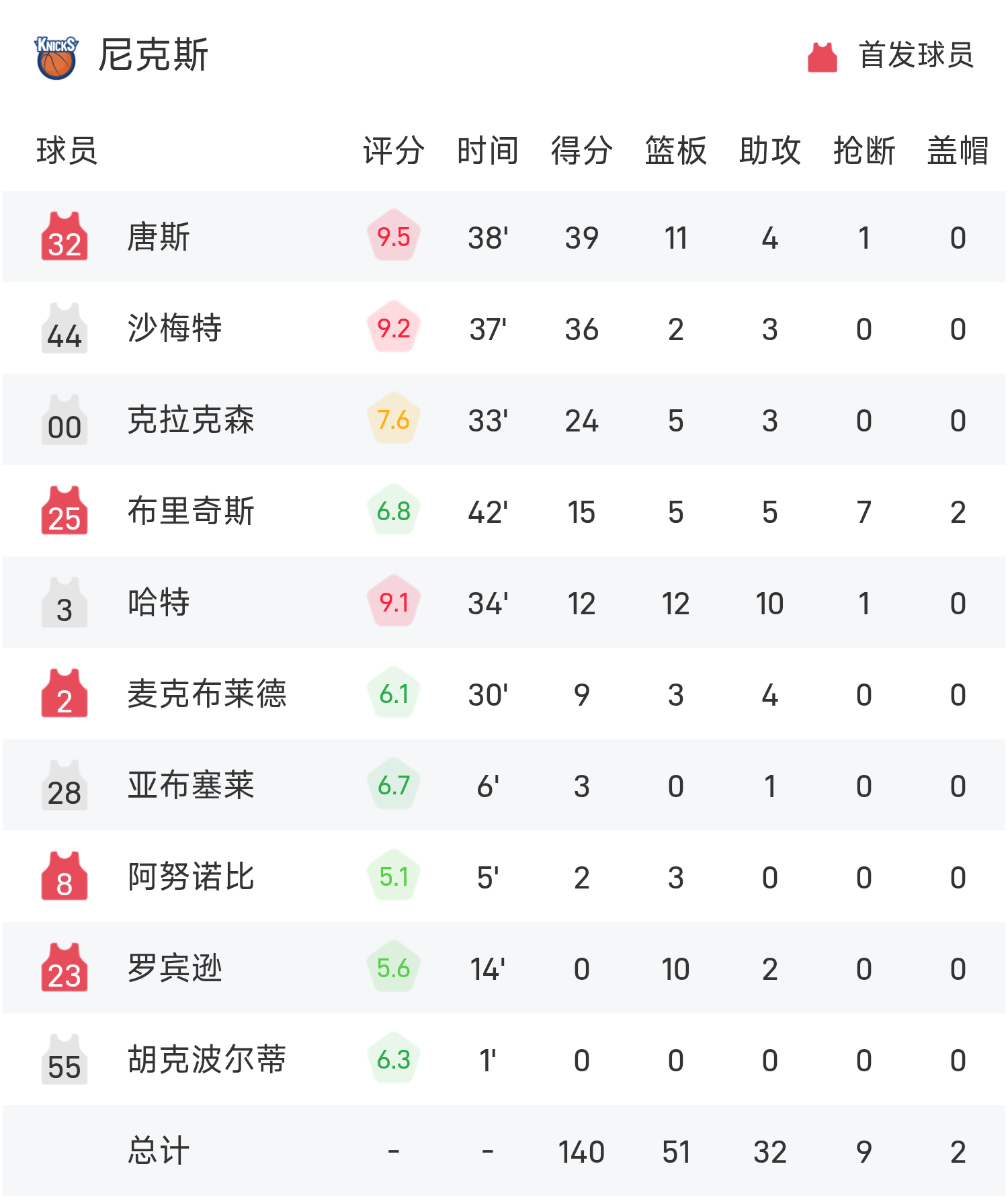 6686体育平台11月15日讯 25/26赛季NBA 常规赛 NBA杯分组赛,尼克斯对阵热火。双方全场战罢,尼克斯140-132战胜热火。唐斯砍下全场最高的39分11板4助,率领尼克斯胜利取胜。