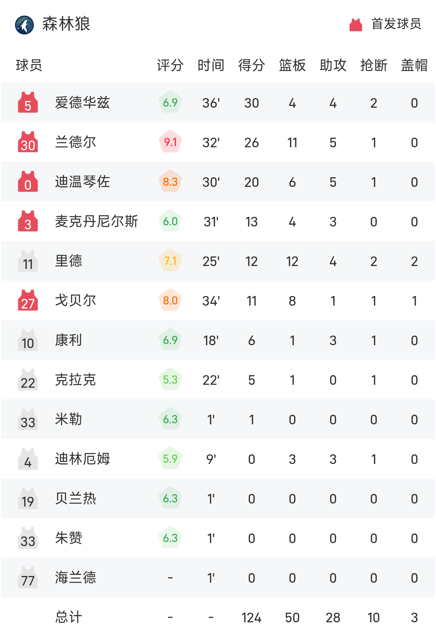 NBA战报:爱德华兹30分,森林狼124-110击败国王