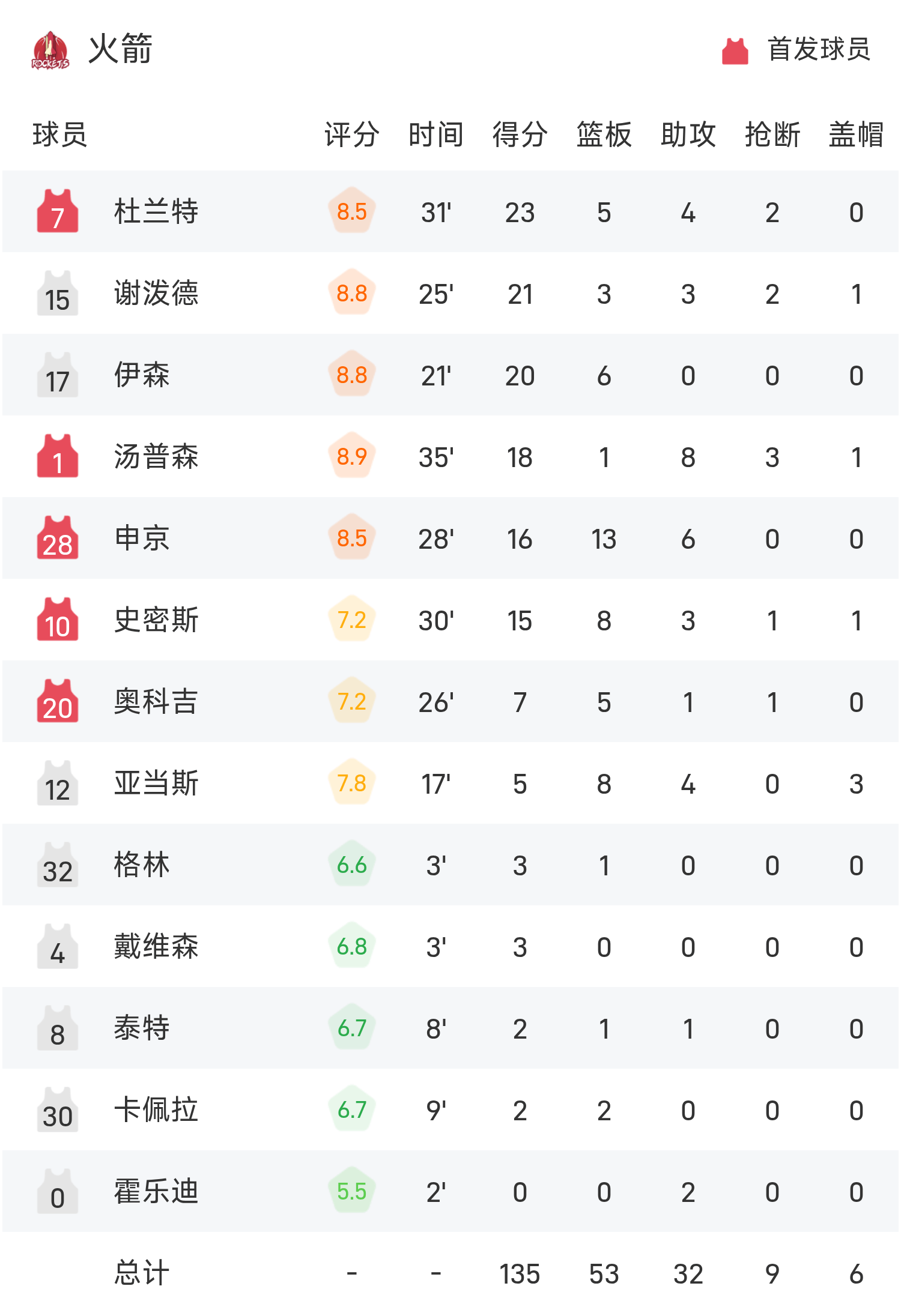 NBA战报:杜兰特23分,火箭135-112大胜奇才