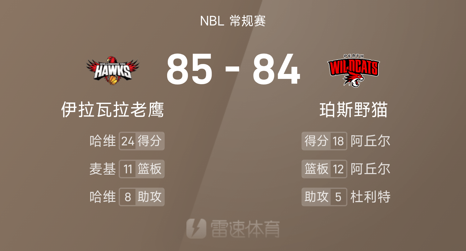 6686体育平台10月25日讯 25/26赛季NBL 常规赛,珀斯野猫对阵伊拉瓦拉老鹰。双方全场战罢,珀斯野猫84-85不敌伊拉瓦拉老鹰。哈维砍下全场最高的24分5板8助,率领伊拉瓦拉老鹰胜利取胜。