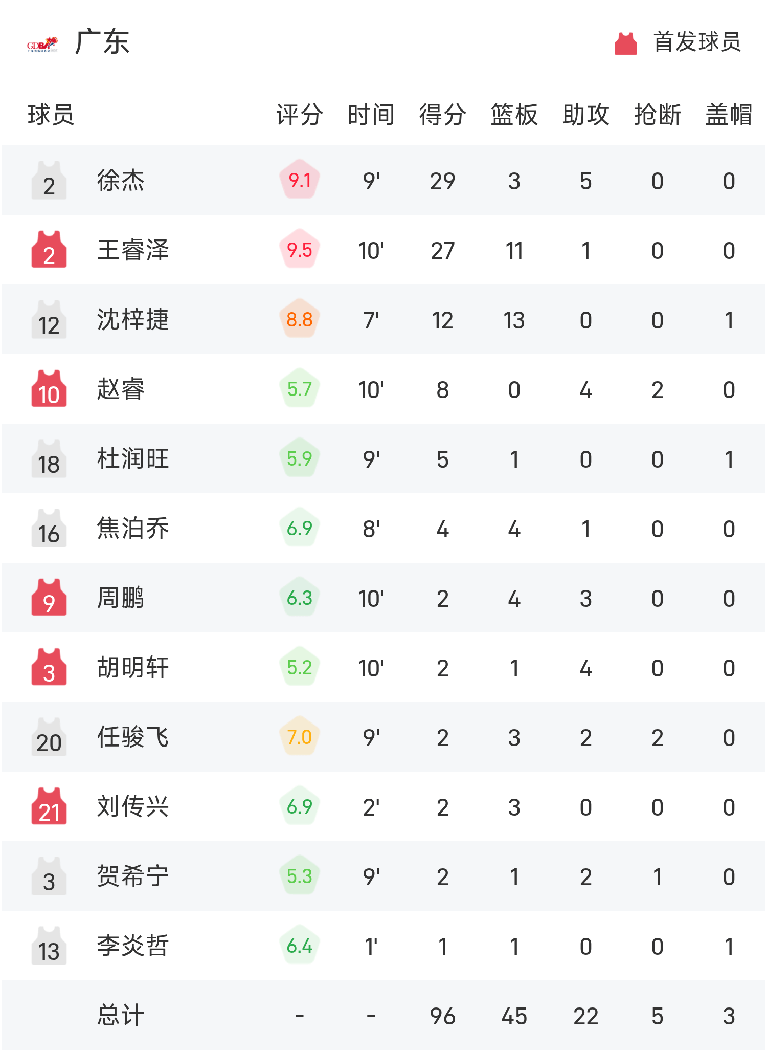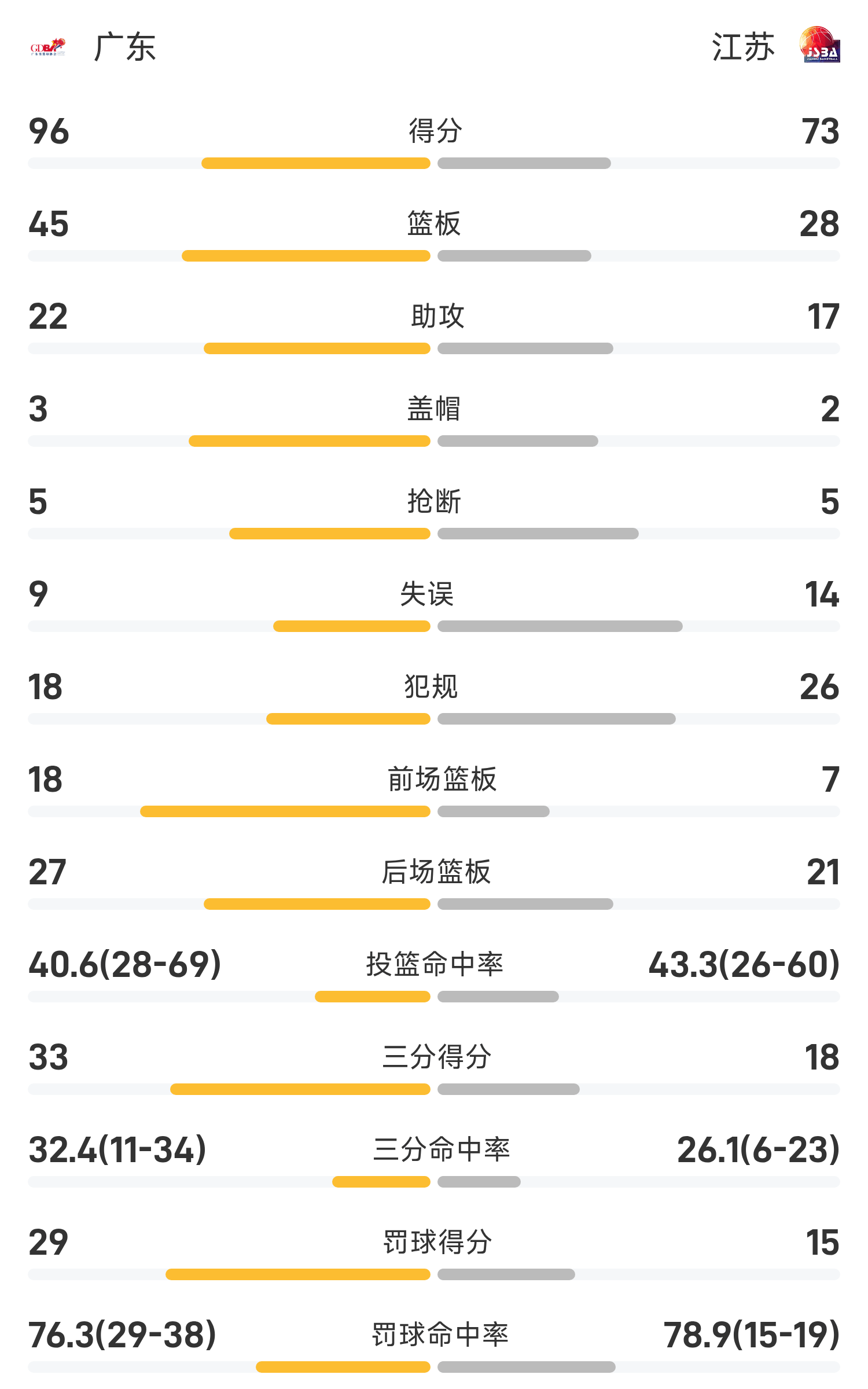 全运男篮战报:徐杰29分,广东96-73逆转大胜江苏