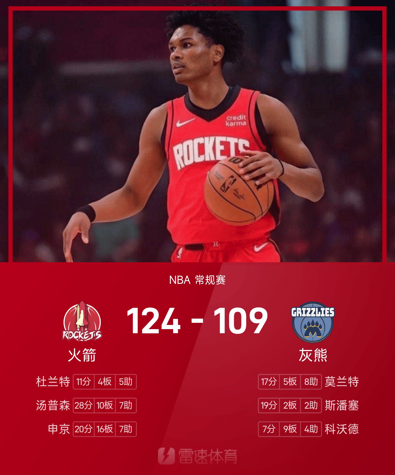 NBA战报:阿门28分10板7助,火箭124-109轻取灰熊